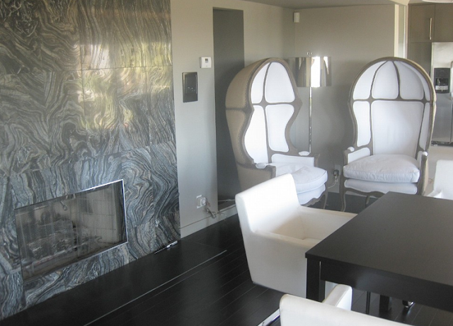 Crazy for the now-made-famous by KWID chairs and the marble fireplace surround. Think I can get that floor lamp passed security?